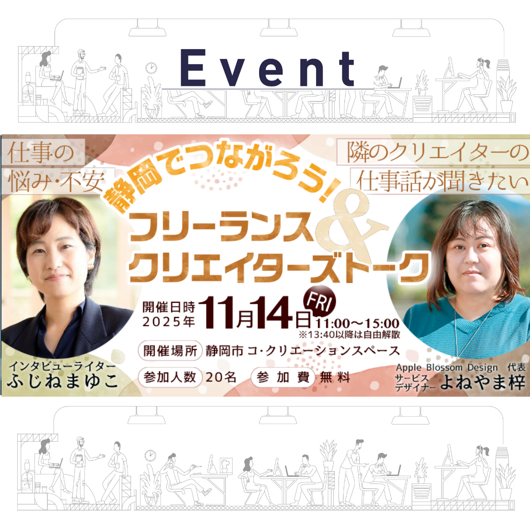 富士市在住のデザイナー よねやま梓と、森町在住のライター ふじねまゆこが、この地域ならではの仕事の仕方、つながり方などを掘り下げます。駆け出しからベテランまで、幅広い出会いと、ビジネスのきっかけを一緒に作りましょう!