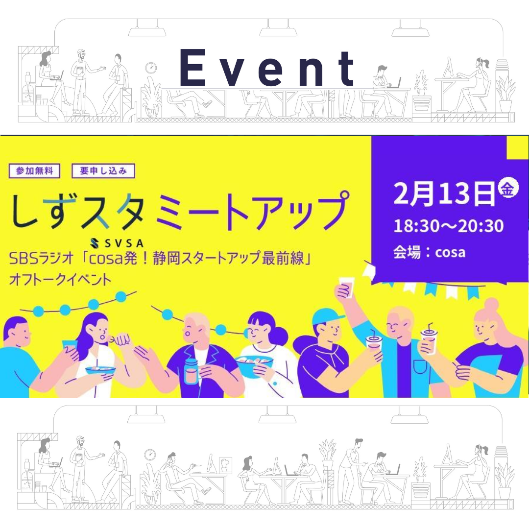 SBSラジオ番組『cosa発!静岡スタートアップ最前線』の収録後オフトークイベントとして、JR静岡駅近くの会場「cosa」でミートアップを開催します!起業、スタートアップ、新規事業、アトツギといったキーワードに興味のある方はぜひお気軽にcosaへお越しください。ゆるっと交流しながらイベントを楽しみましょう!参加費は【無料】となりました! 飲食希望の方は実費でお支払ください。お仕事帰りに、ぜひお立ち寄りください。