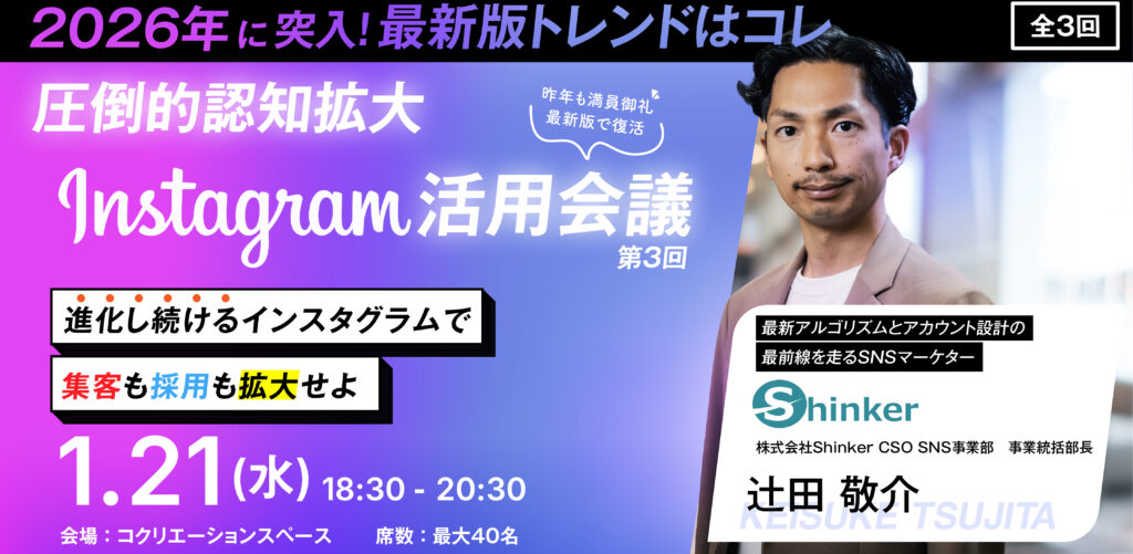 【1/21(水)夜】2026年に突入!最新トレンド 圧倒的認知拡大 インスタグラム活用会議 vol.3 〜全3回シリーズ〜