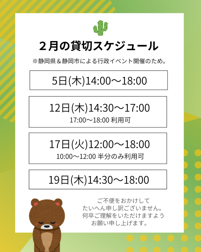 【2月の貸切スケジュール】一般利用不可の日程についてご案内🙇♀️