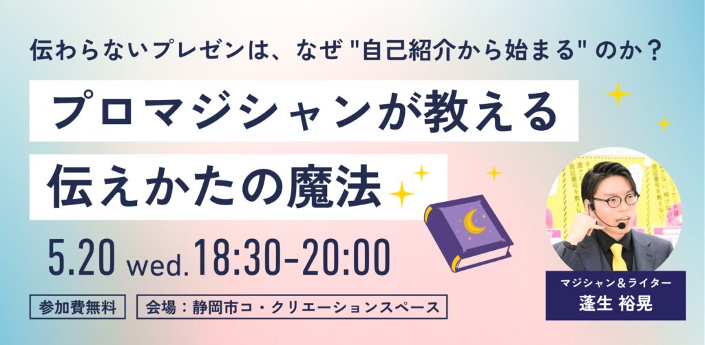 【5/20(水)夜】伝わらないプレゼンは、なぜ”自己紹介から始まる”のか? 〜プロマジシャンが教える伝え方の魔法〜